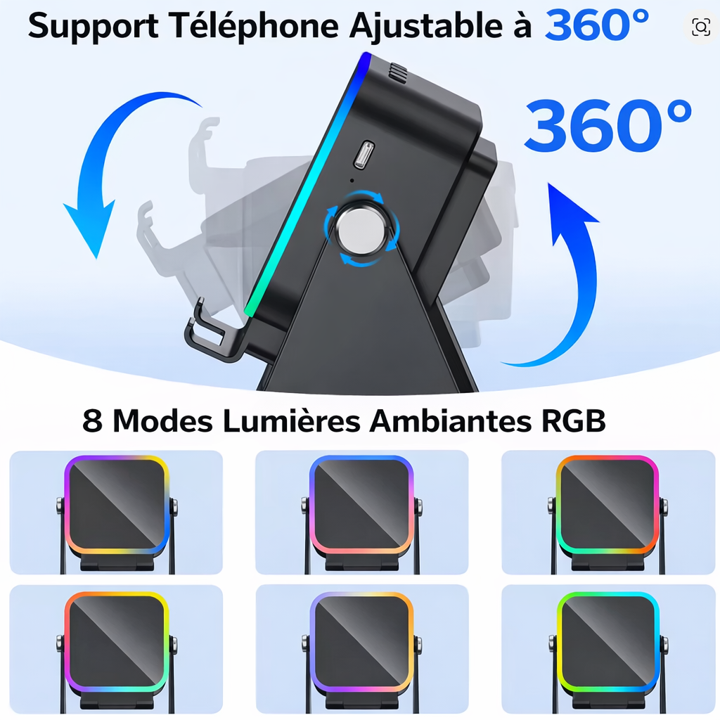- Support ultra-solide à vue 360° : Son support à basculement libre offre une stabilité maximale et une orientation totalement personnalisable, pour un confort visuel parfait en toute situation.